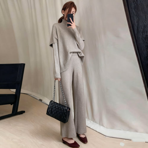 3COLORS秋冬シンプル無地ハイネックスリットニットセーター&合わせやすいロングパンツセットアップ