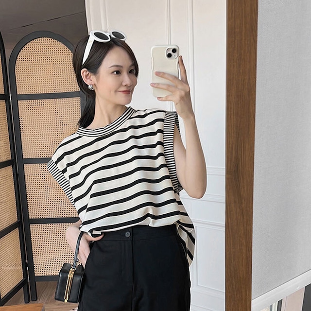 ストライプクルーネック無袖コーデしやすいトップス【DL-2802】