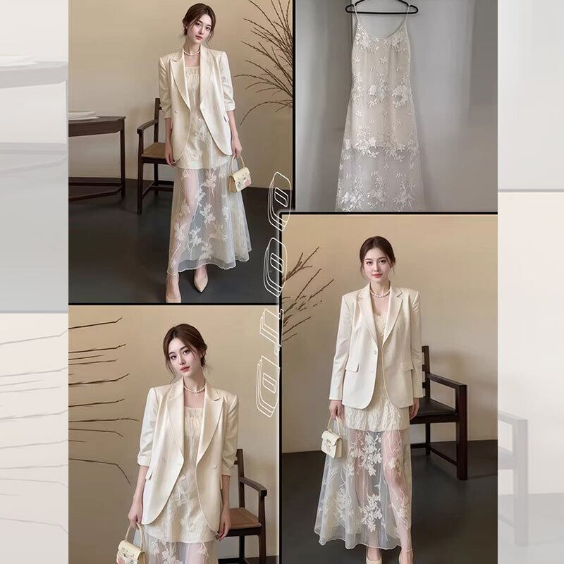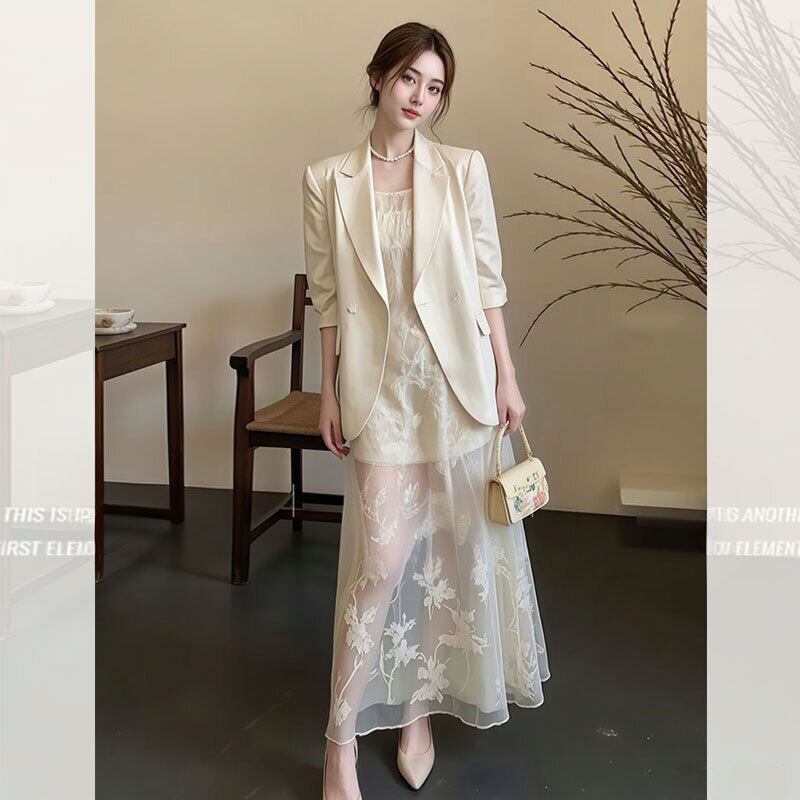 オフホワイト ブレザー + レース刺繍 シースルーキャミワンピース セットアップ エレガント オフィス・デート