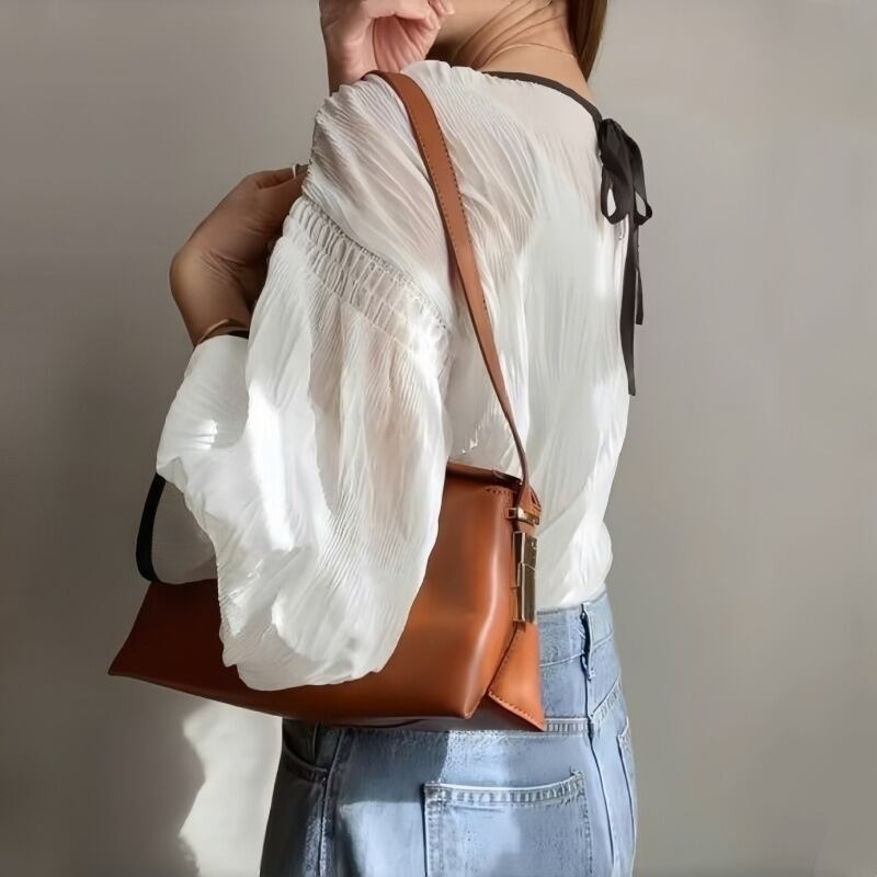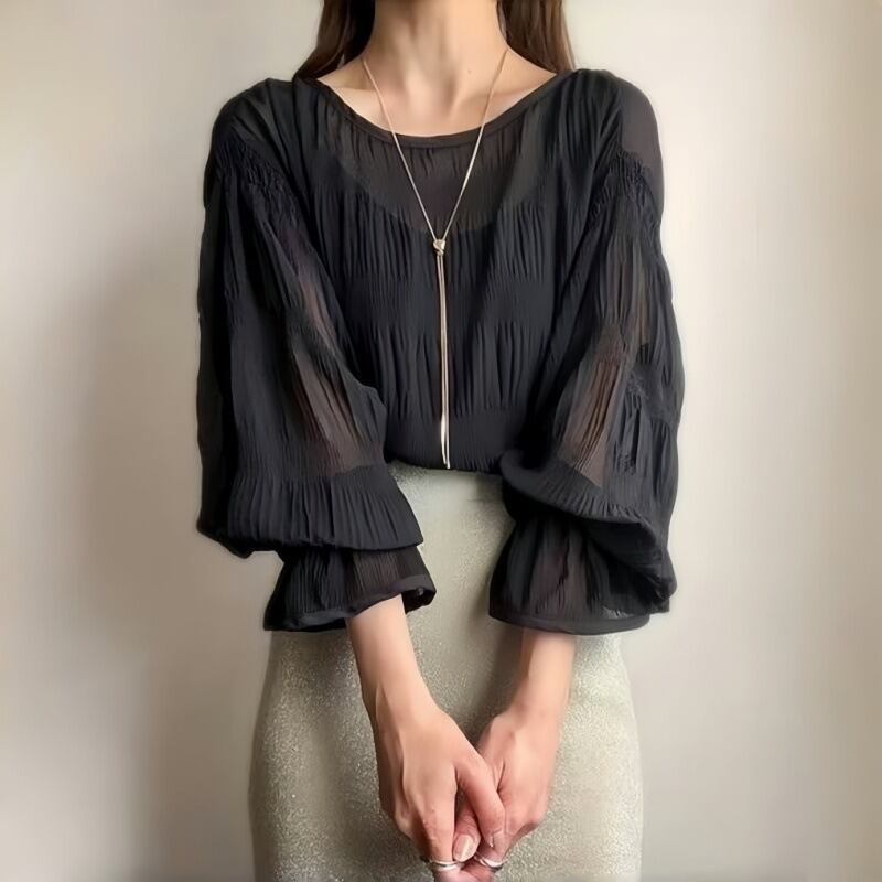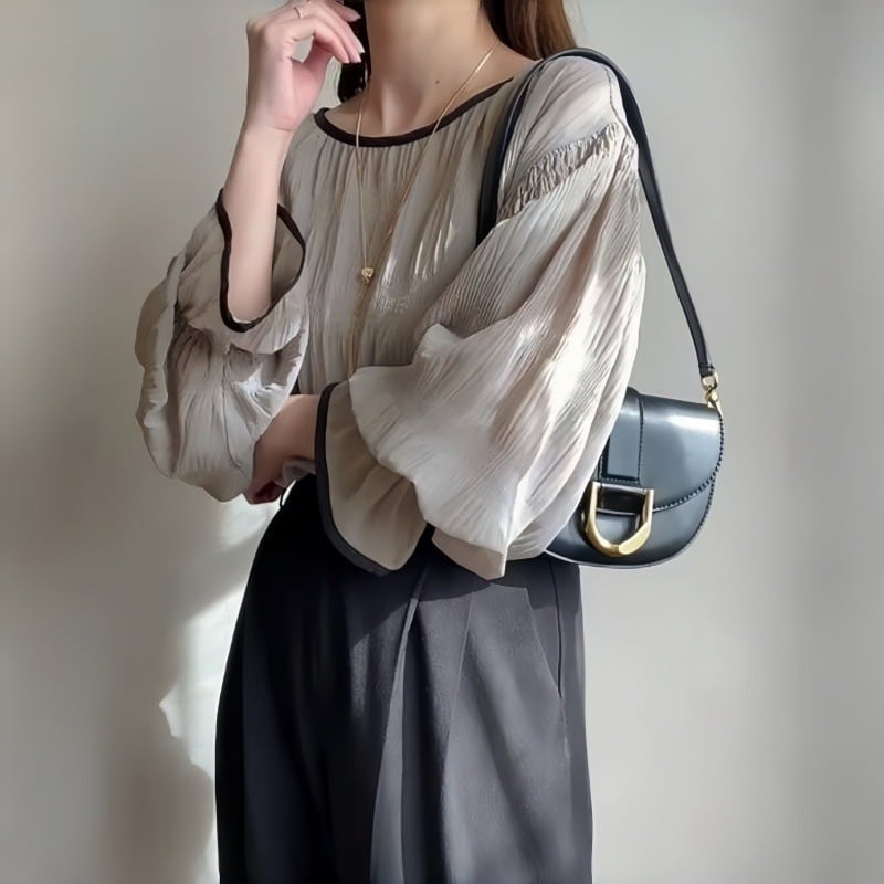 プリーツ ブラウス パフスリーブ 黒トリムトップス【AR-16】