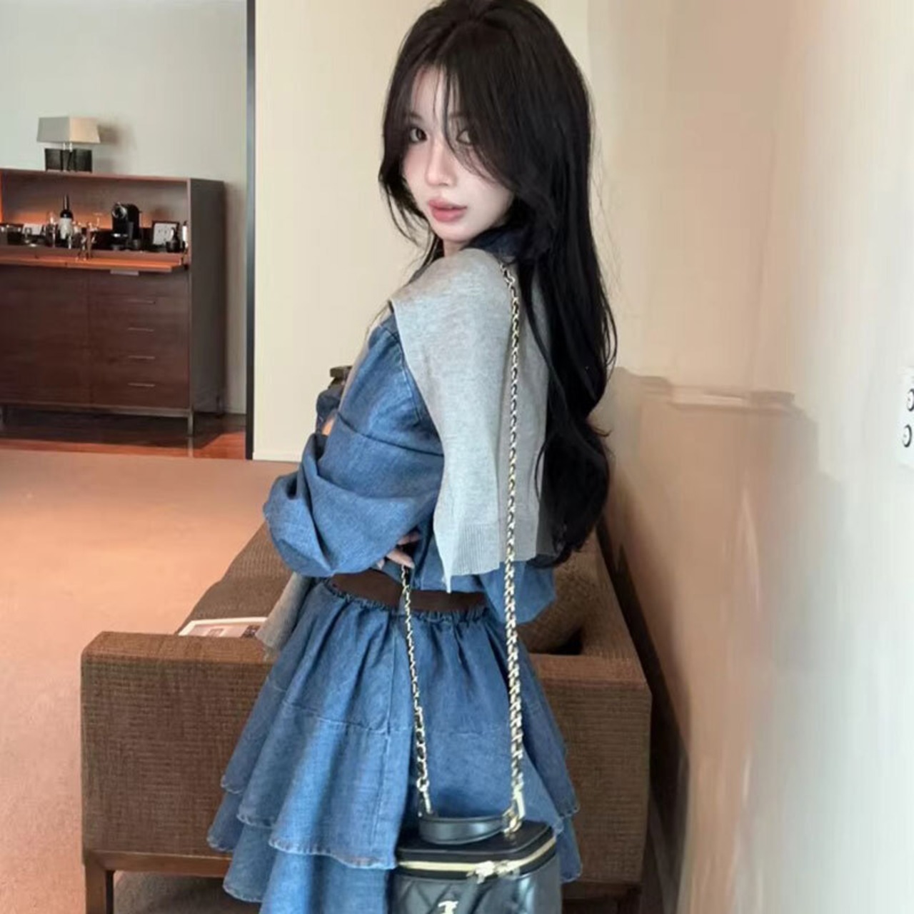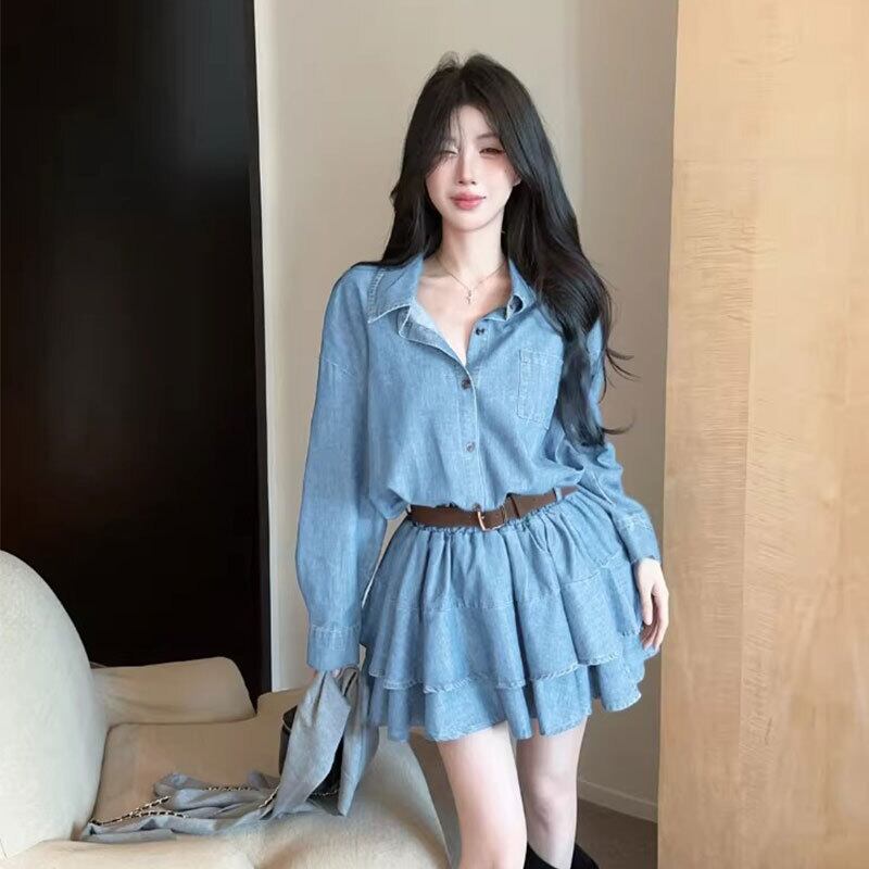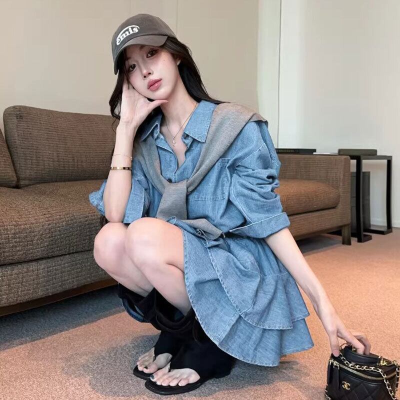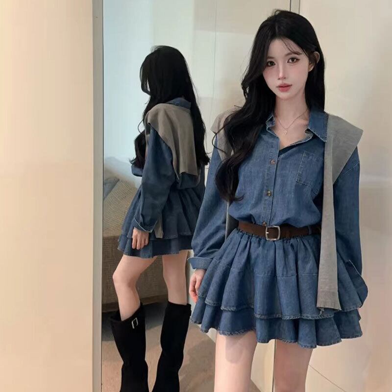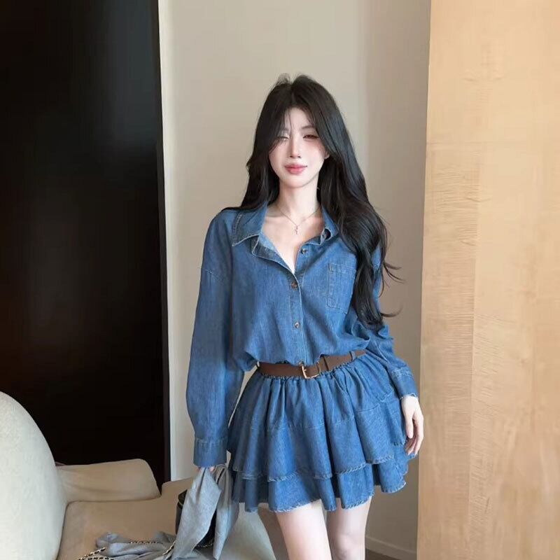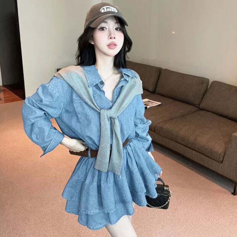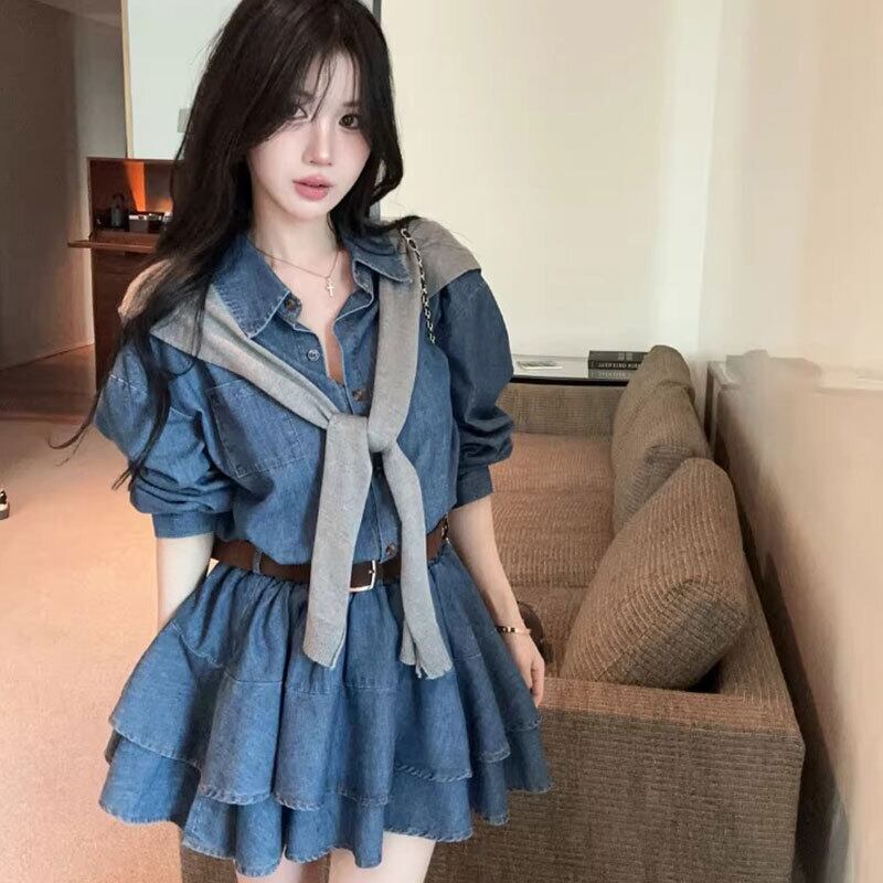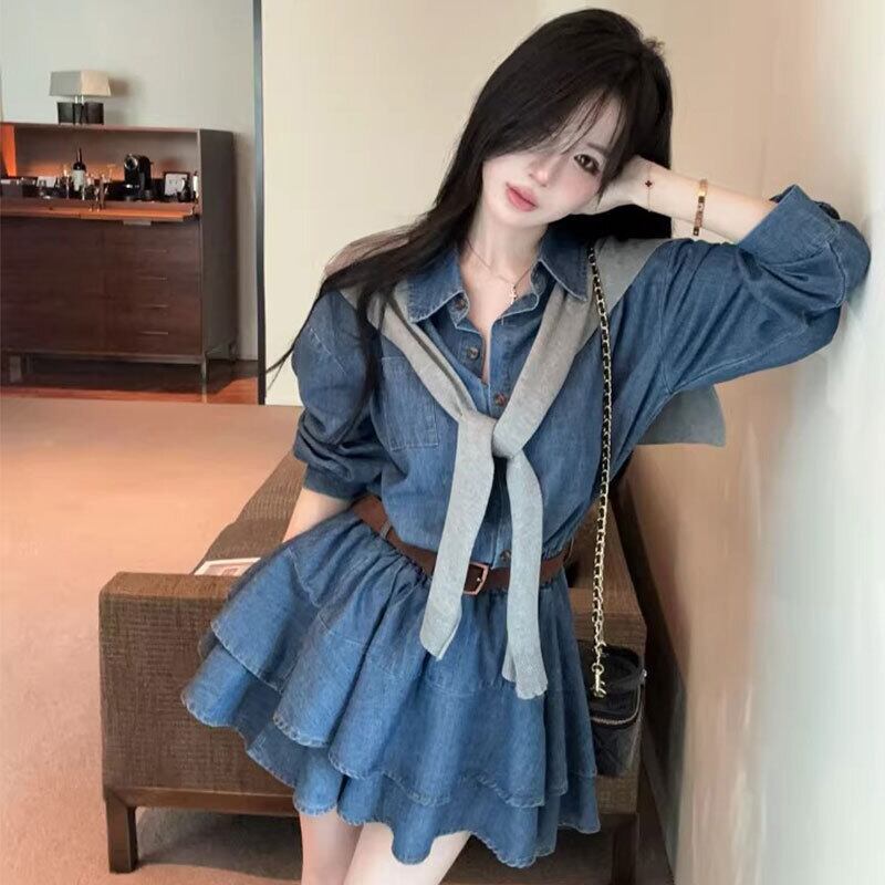 ブルー デニム シャツドレス ブラウンベルト ティアード スカート カジュアル 通勤・デート(ケープとベルトなし)【AR-25】