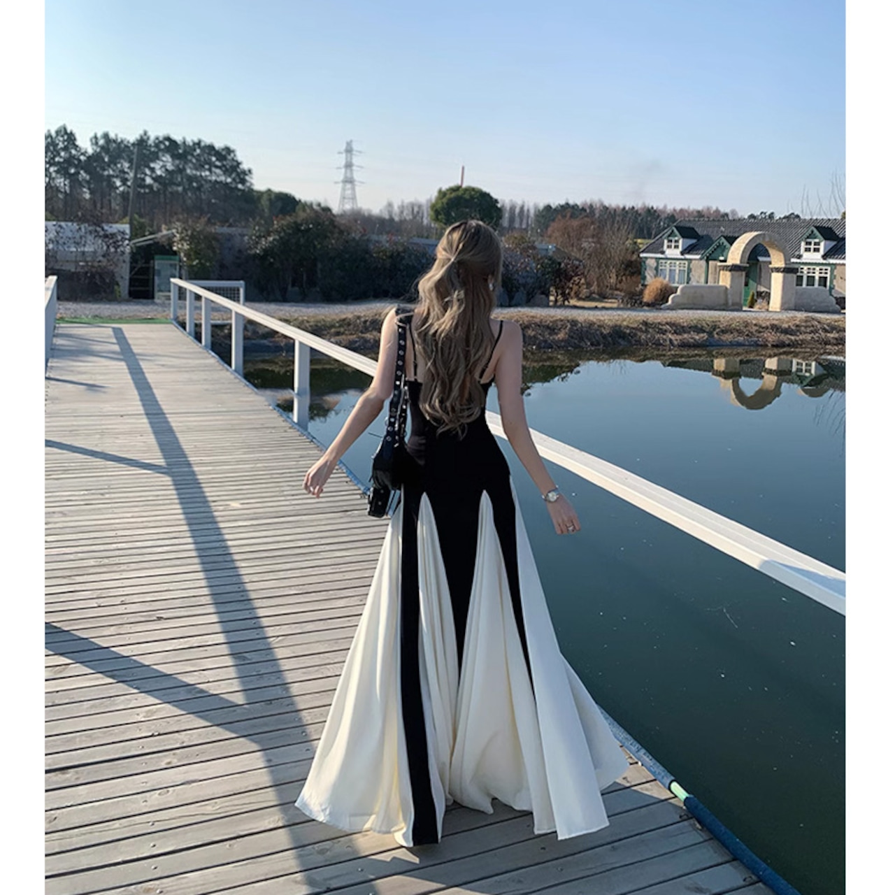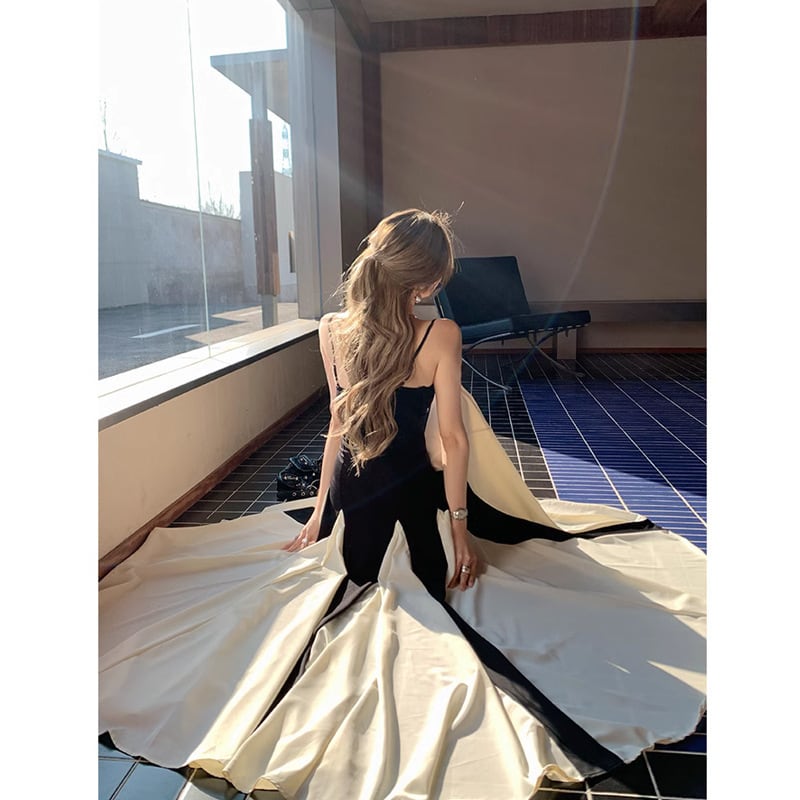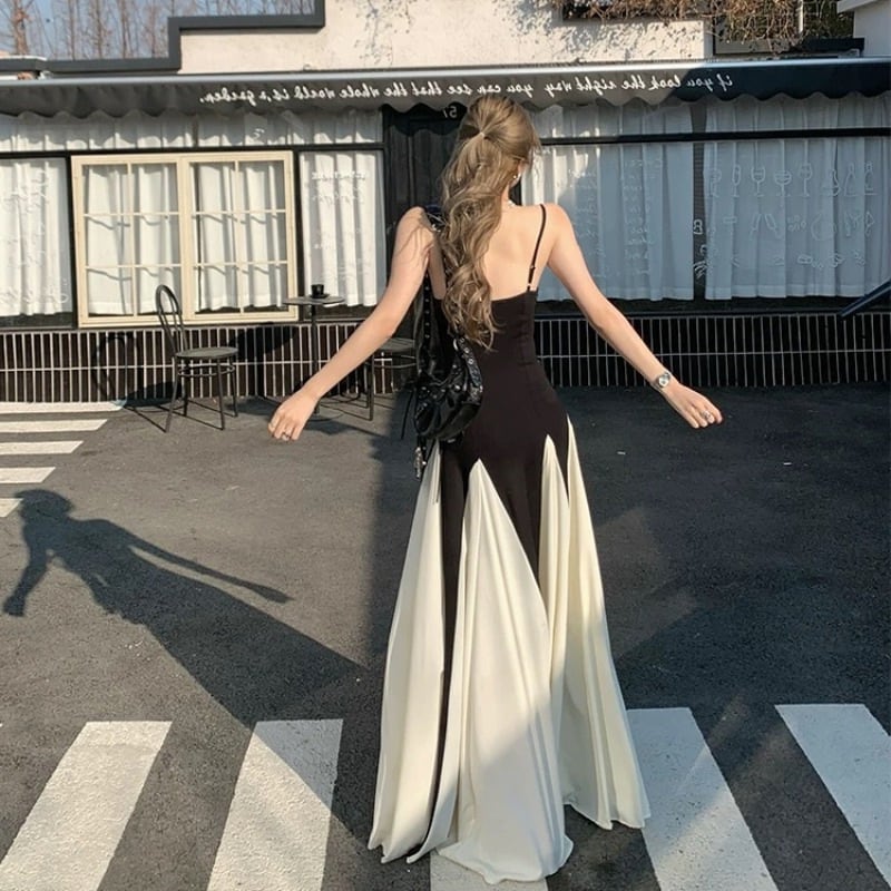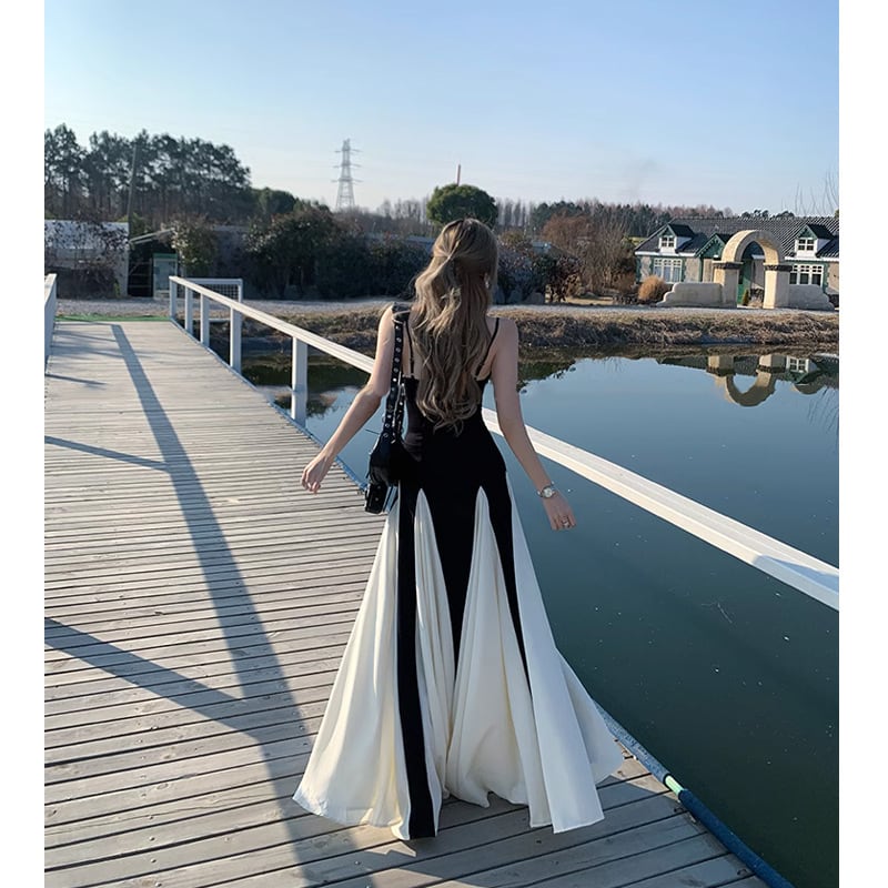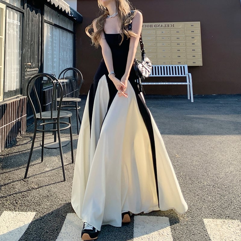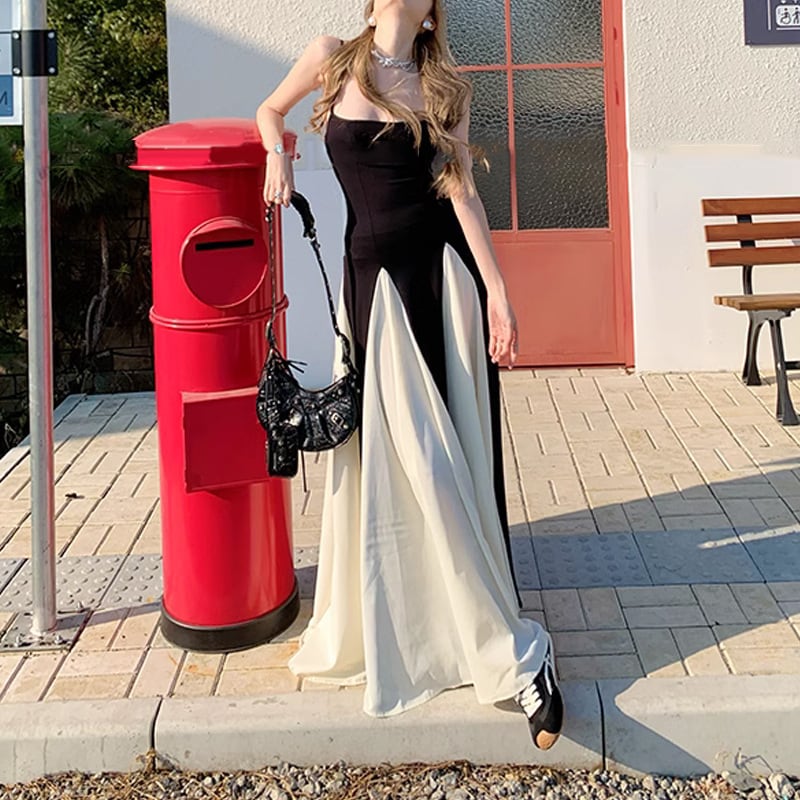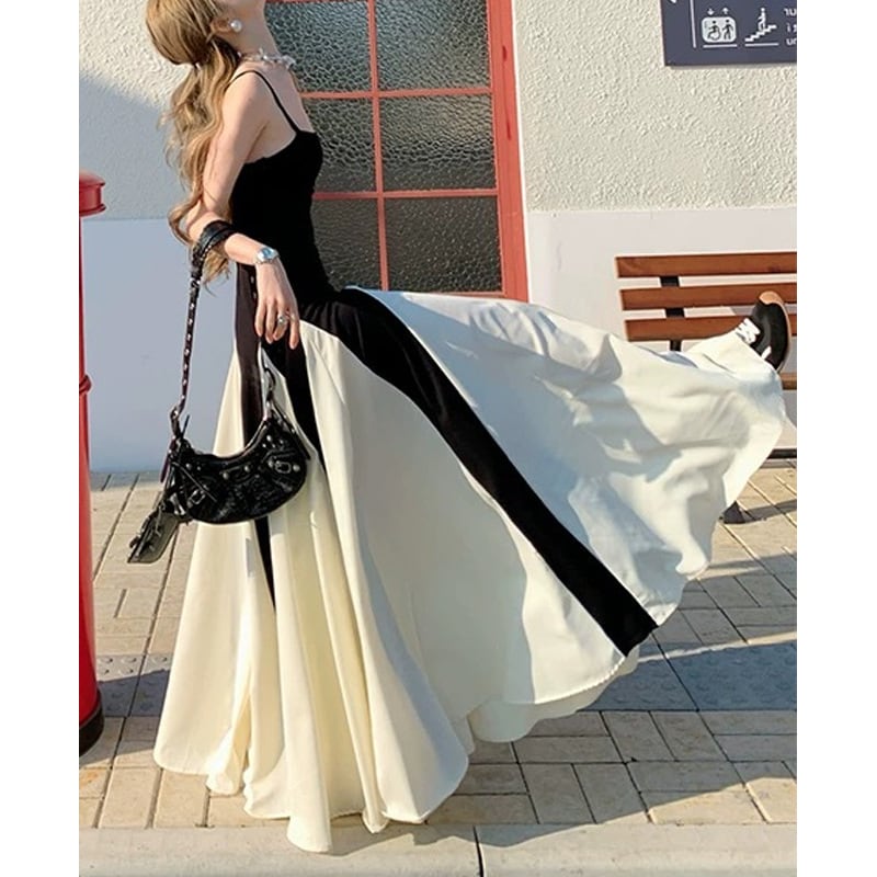 レトロストリート風 バイカラーロングワンピース スリムウエスト フレアスカート【AR-38】
