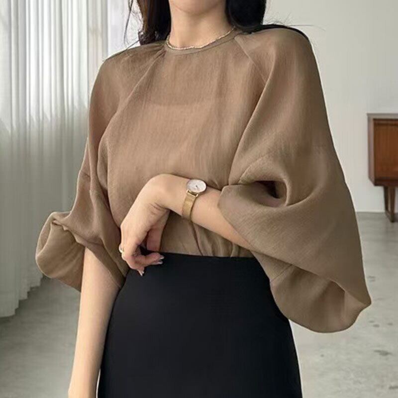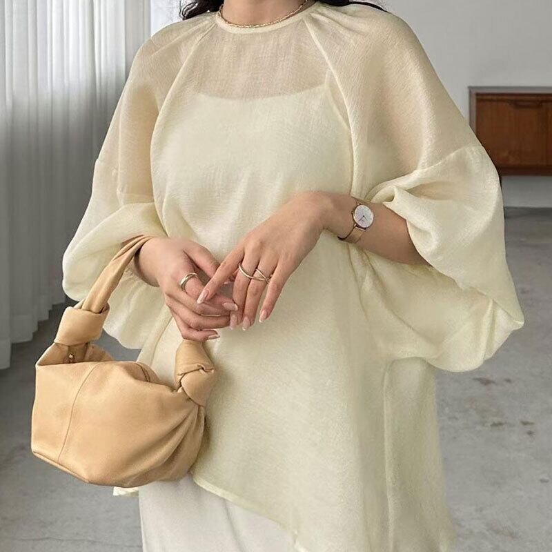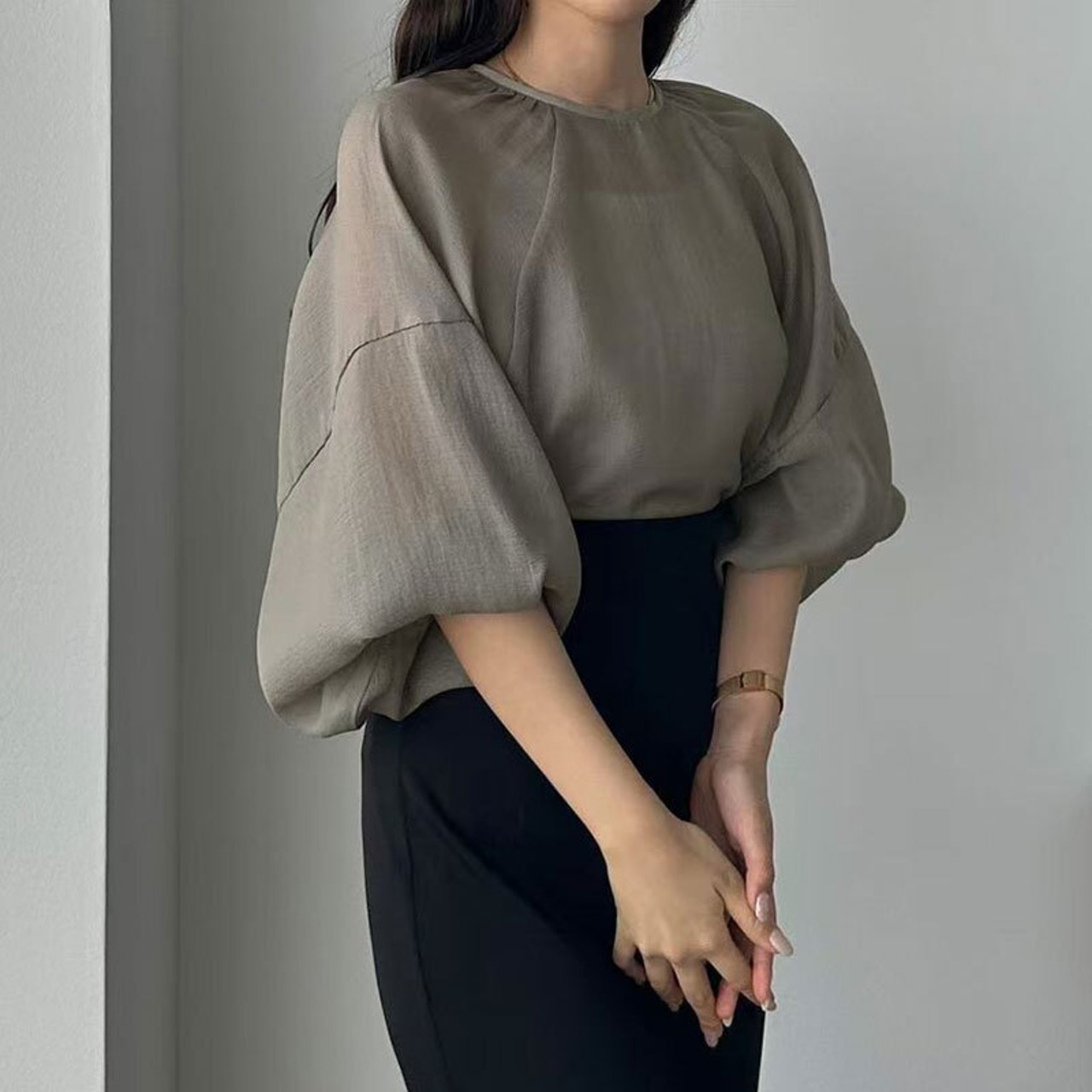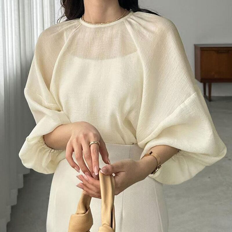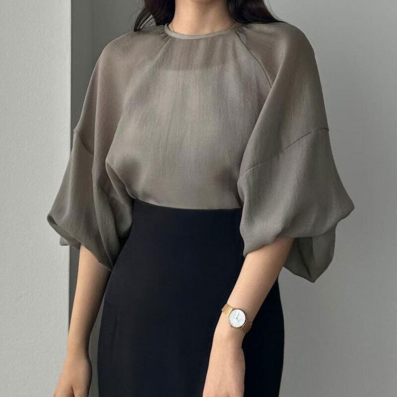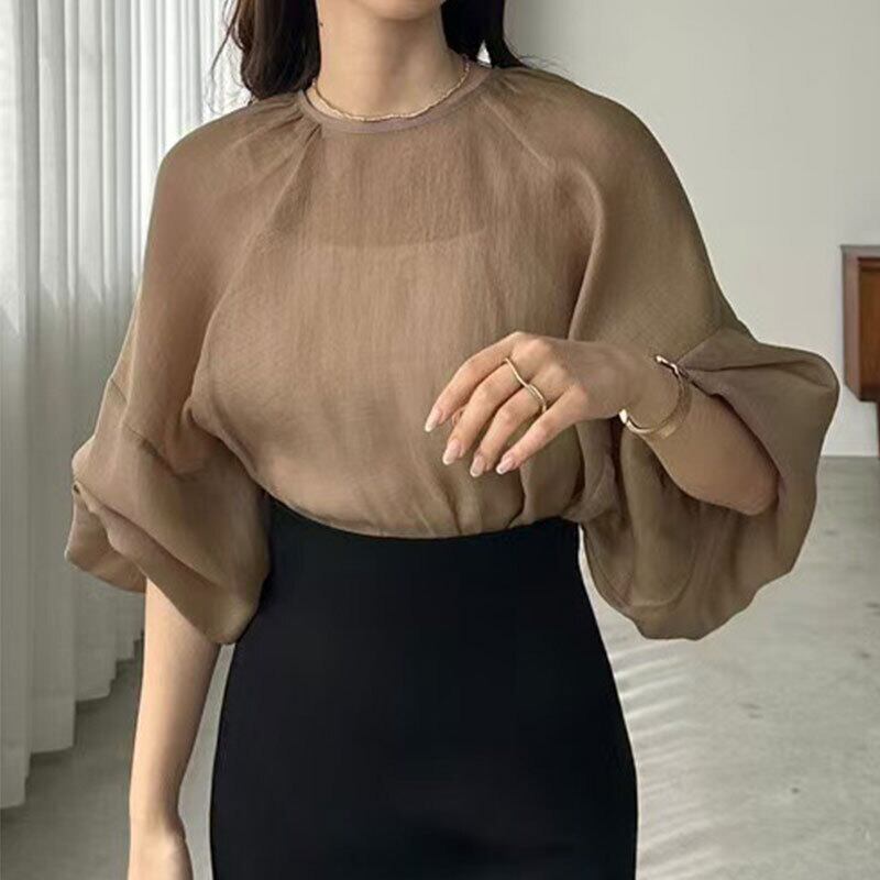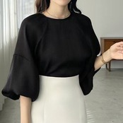 シアーバルーンスリーブブラウス レディース ゆったり 体型カバーシフォントップス【AR-43】