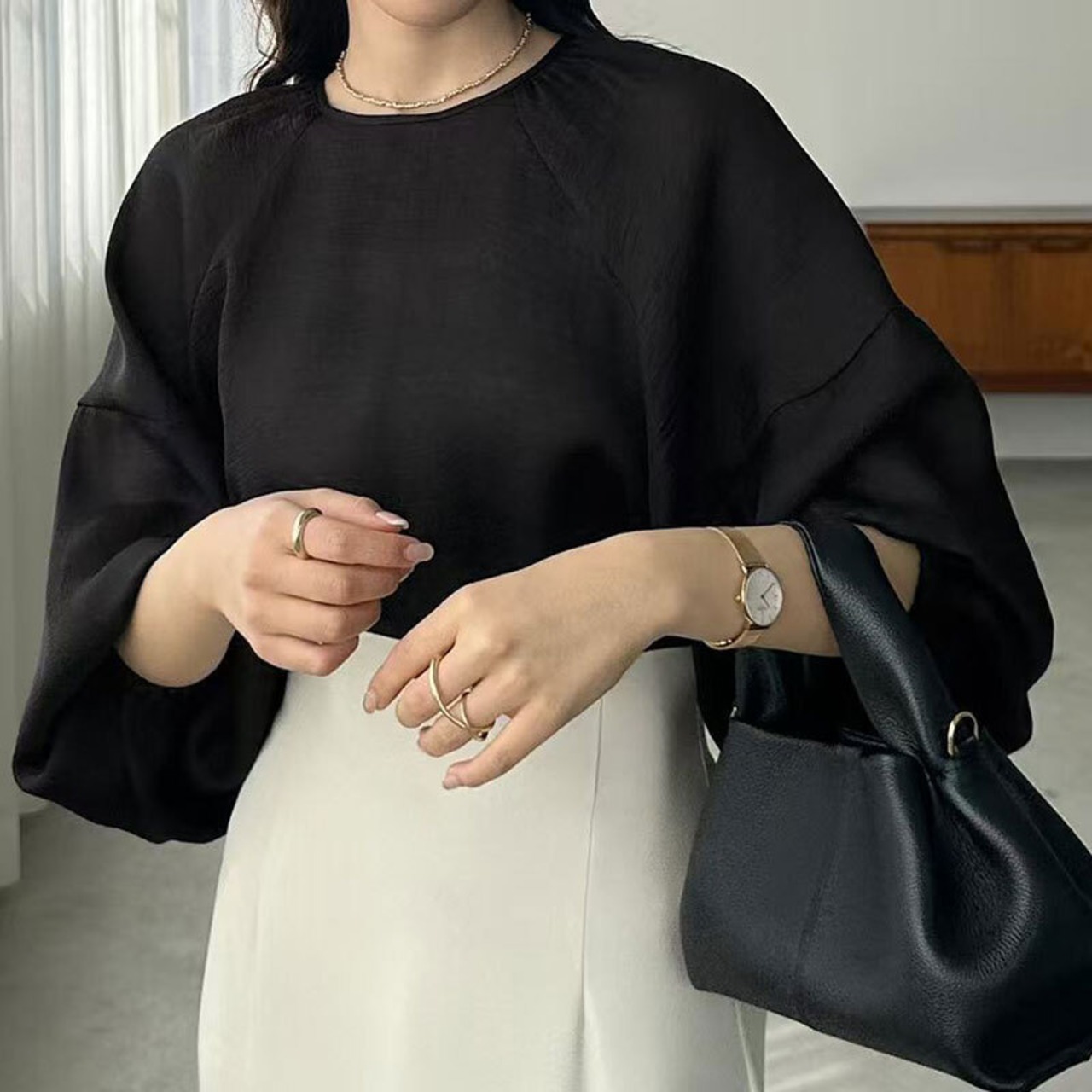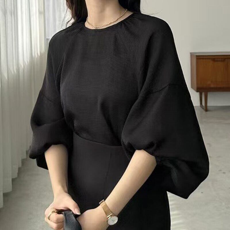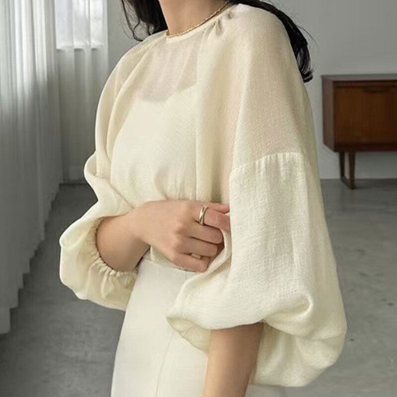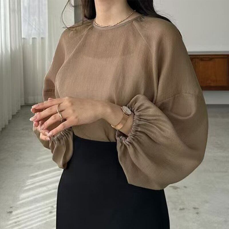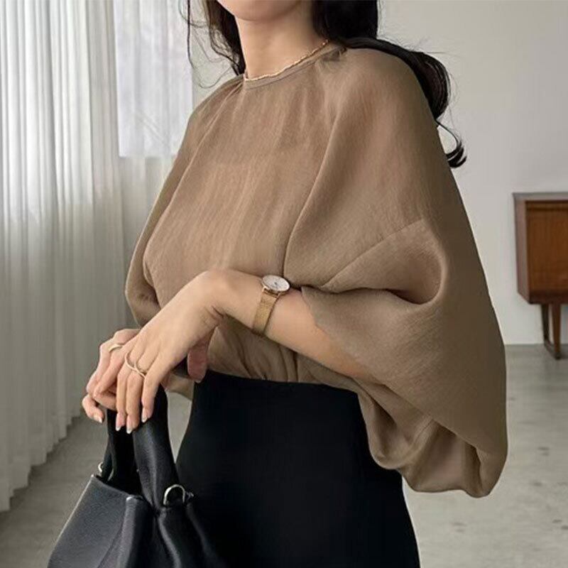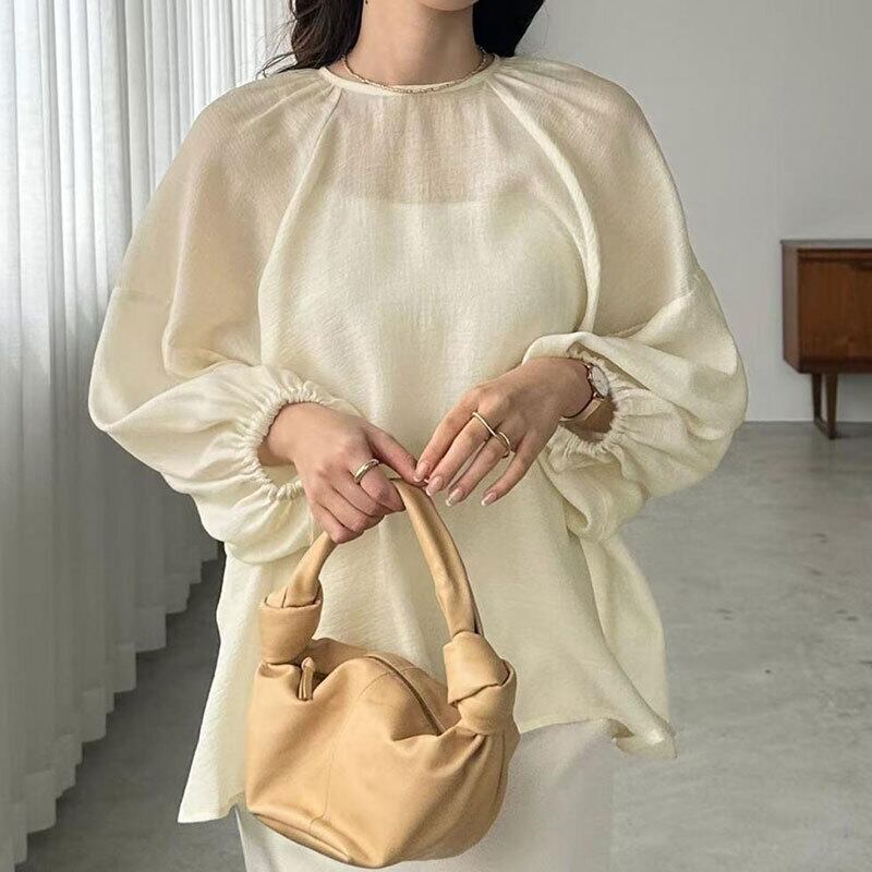 シアーバルーンスリーブブラウス レディース ゆったり 体型カバーシフォントップス【AR-43】