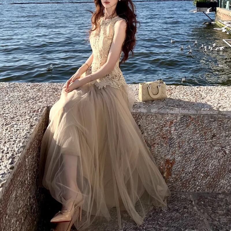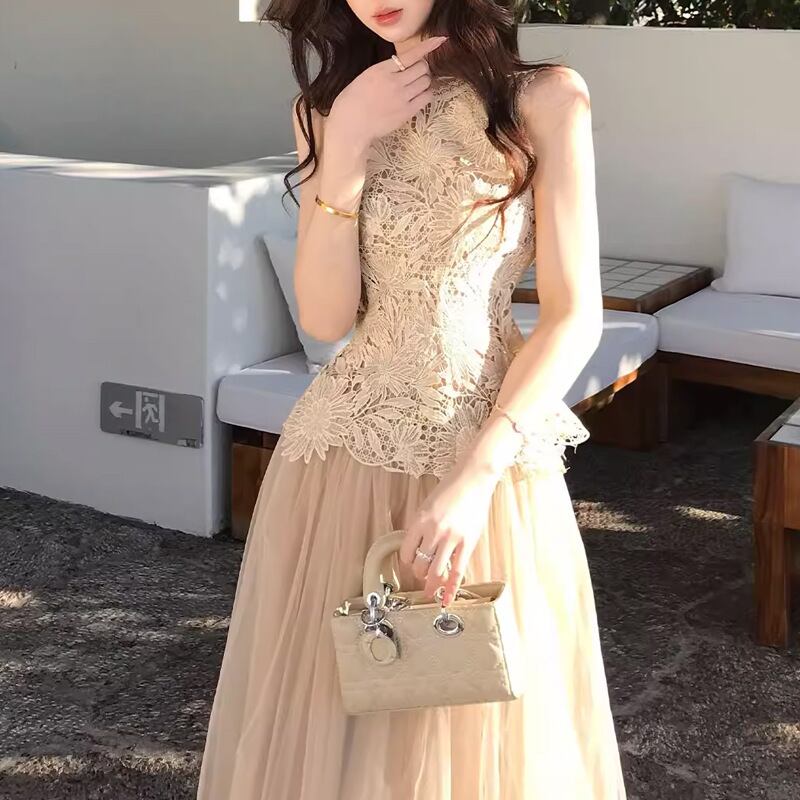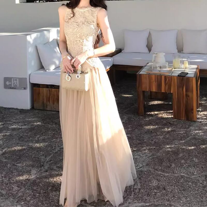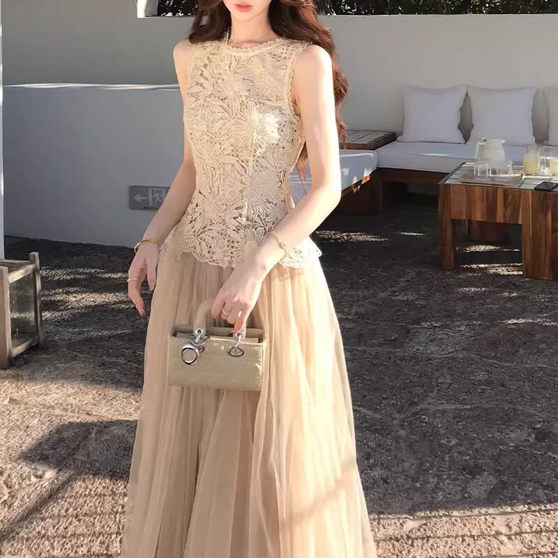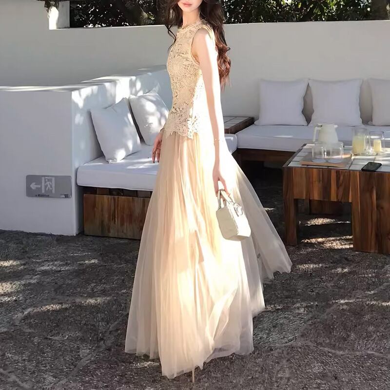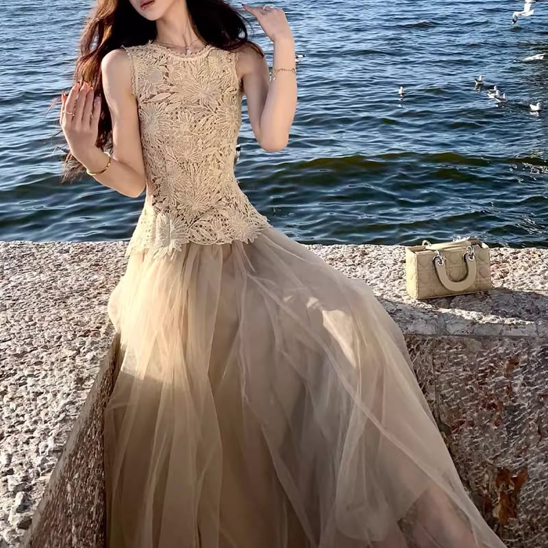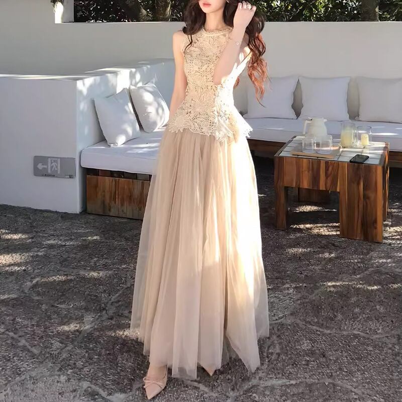 レース チュール セットアップ レディース ノースリーブ ロングスカート きれいめ デート 結婚式 パーティー【AR-47】