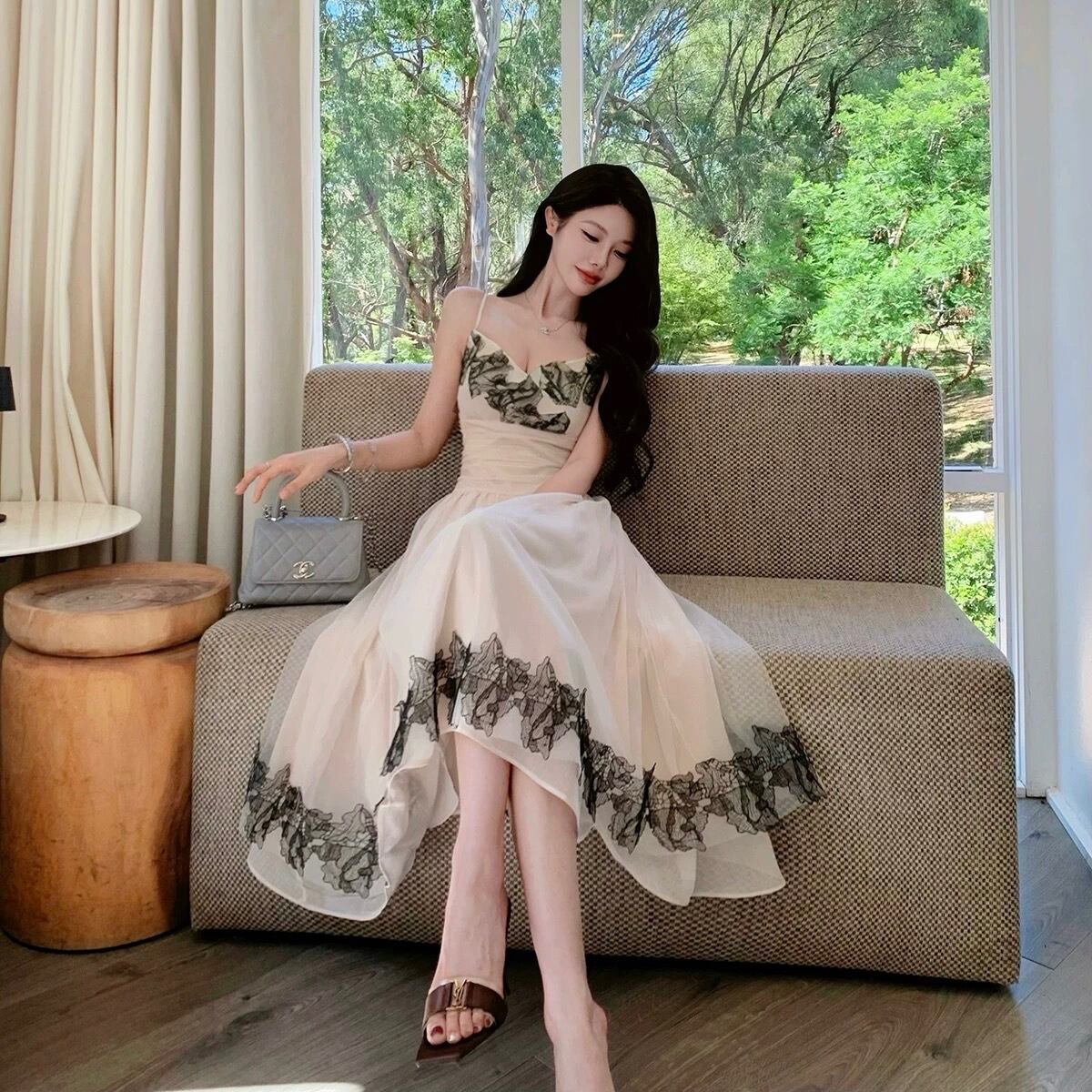 レディース ノースリーブワンピース レース刺繍 ハイウエスト エレガント パーティードレス お呼ばれ【AR-51】
